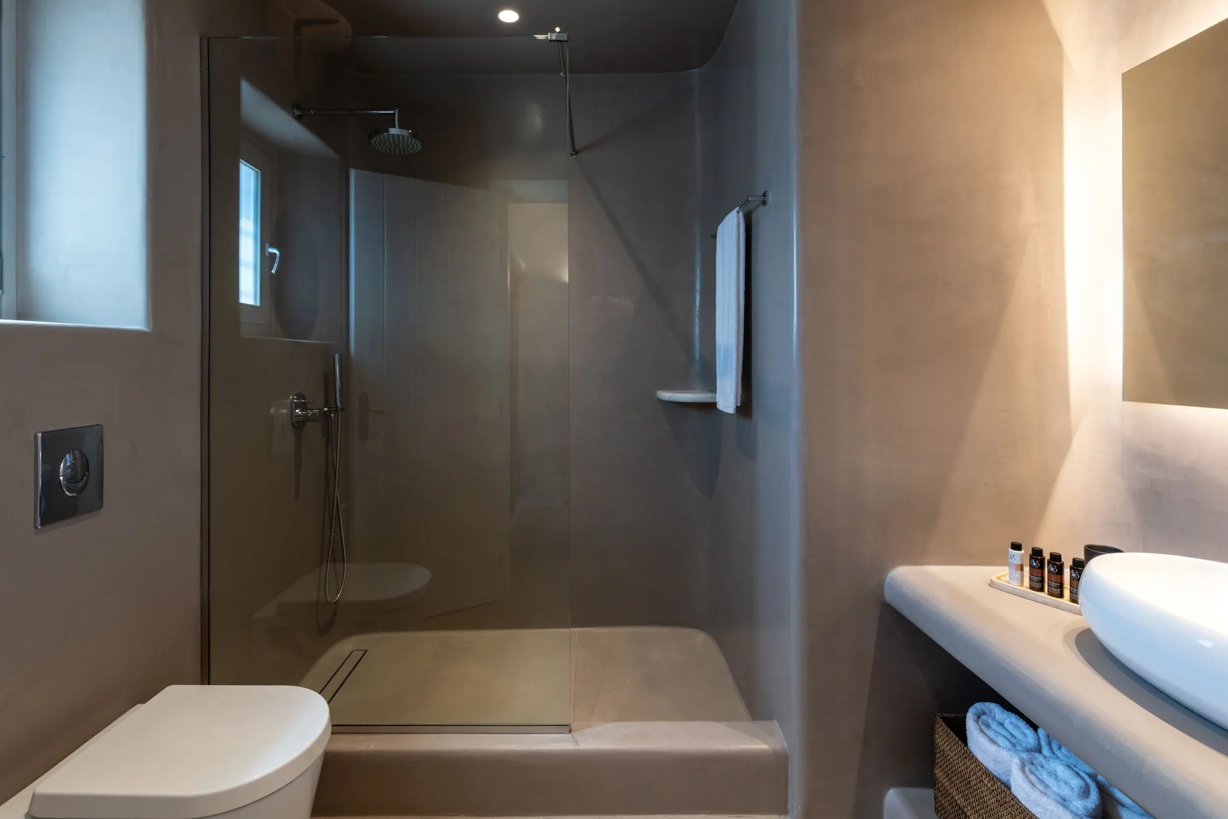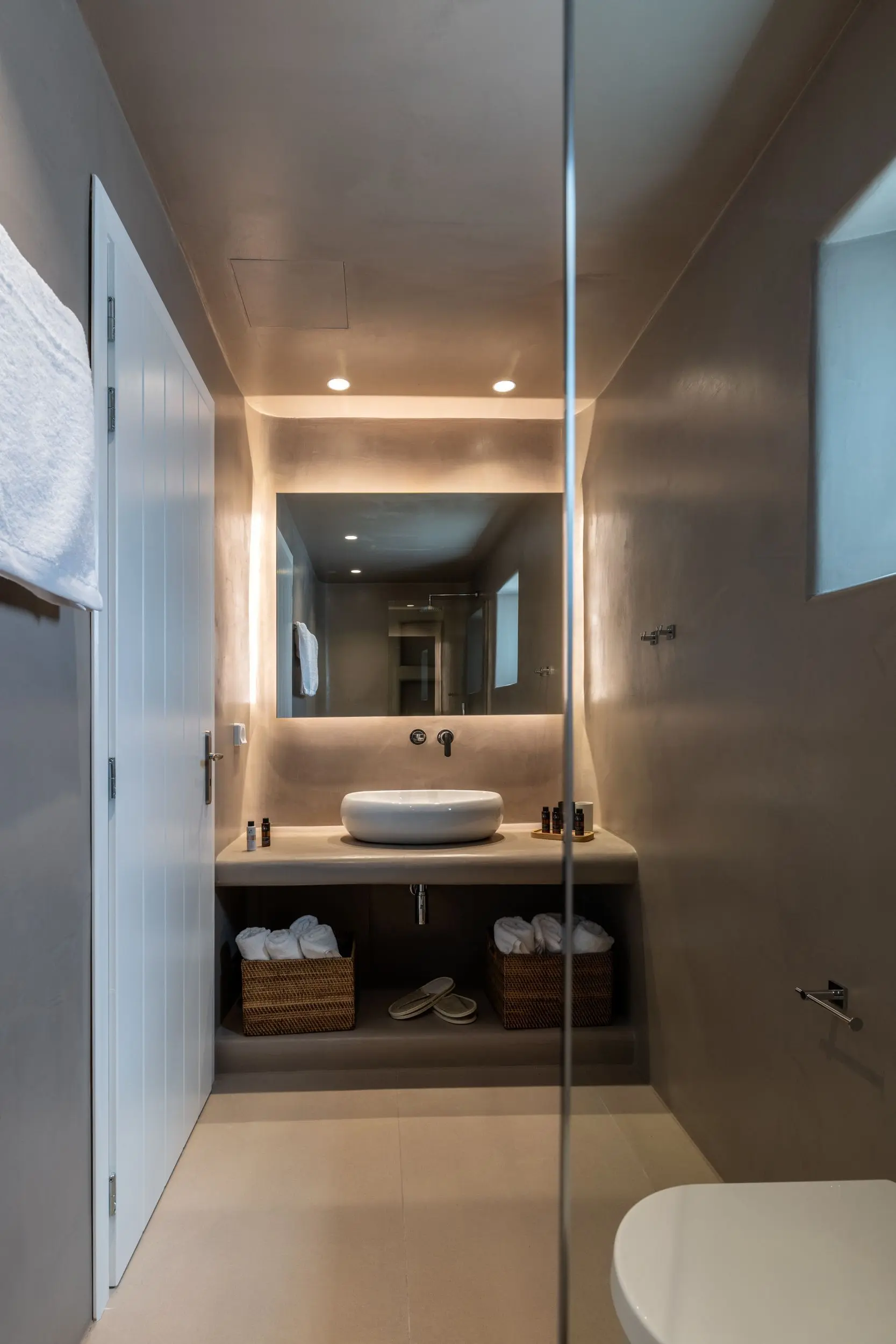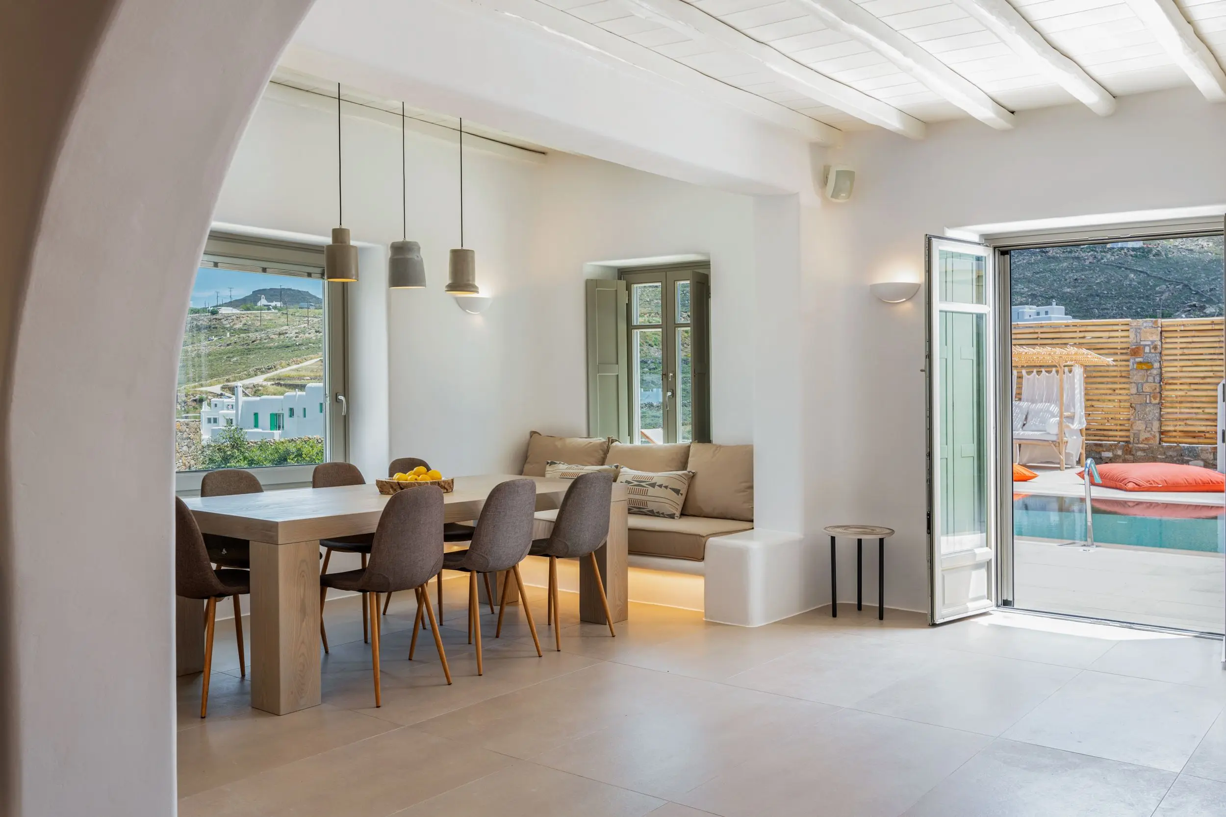 A newly built complex of three private villas is situated among fields, 600 meters above Ftelia Beach. Each villa boasts its own unique character, promising tranquility and comfort while also offering the possibility of entertainment at the nearby Alemagou beach Club. All villas are constructed to ensure complete privacy from one another. Additionally, guests can enjoy access to a shared gym located on the estate. The complex also offers the flexibility for large groups to combine all three villas into one cozy accommodation with a total of 11 bedrooms.
