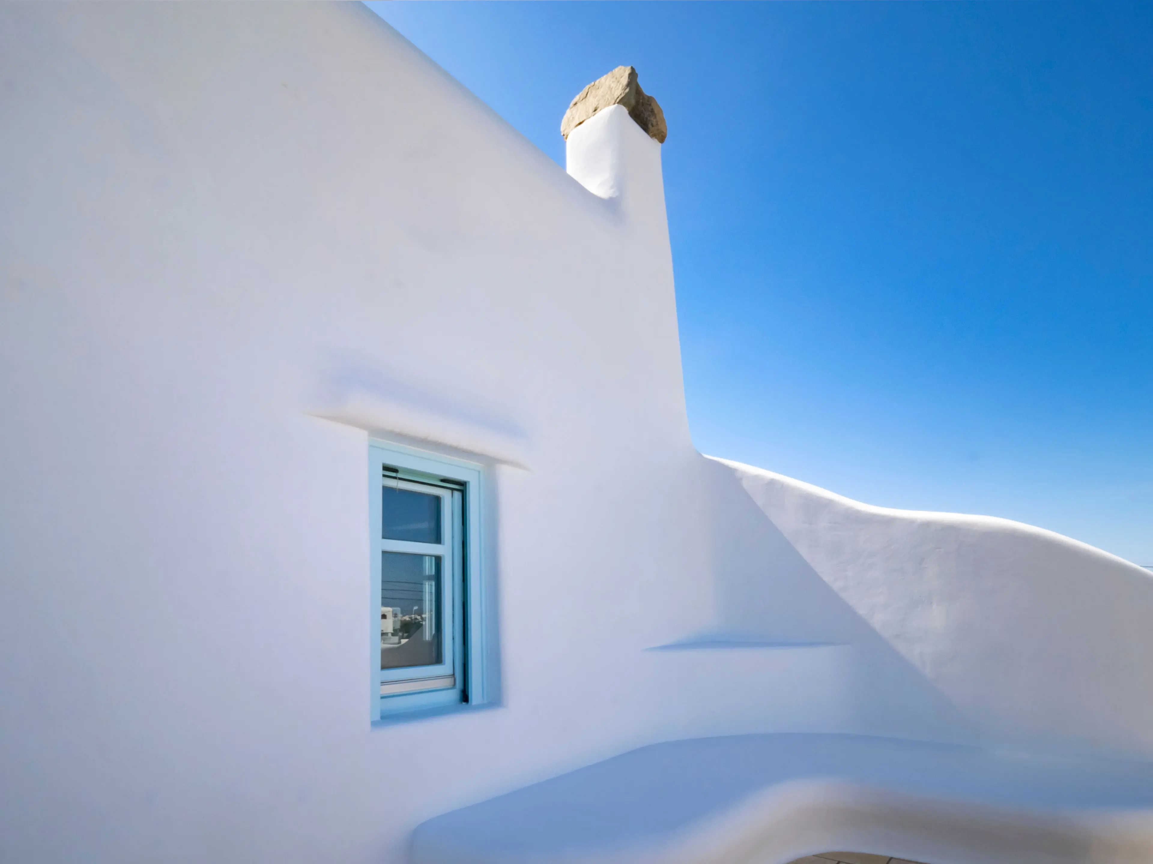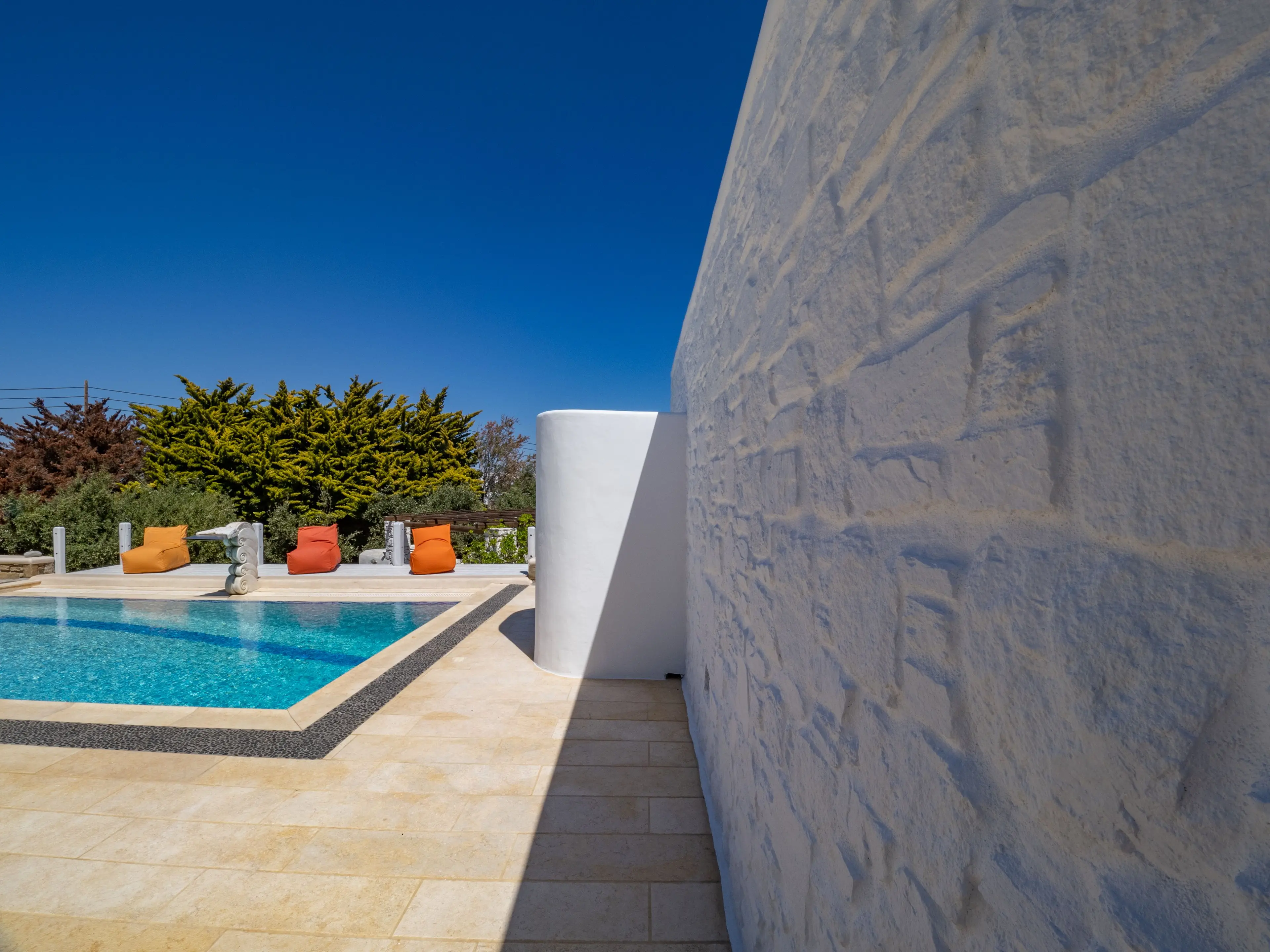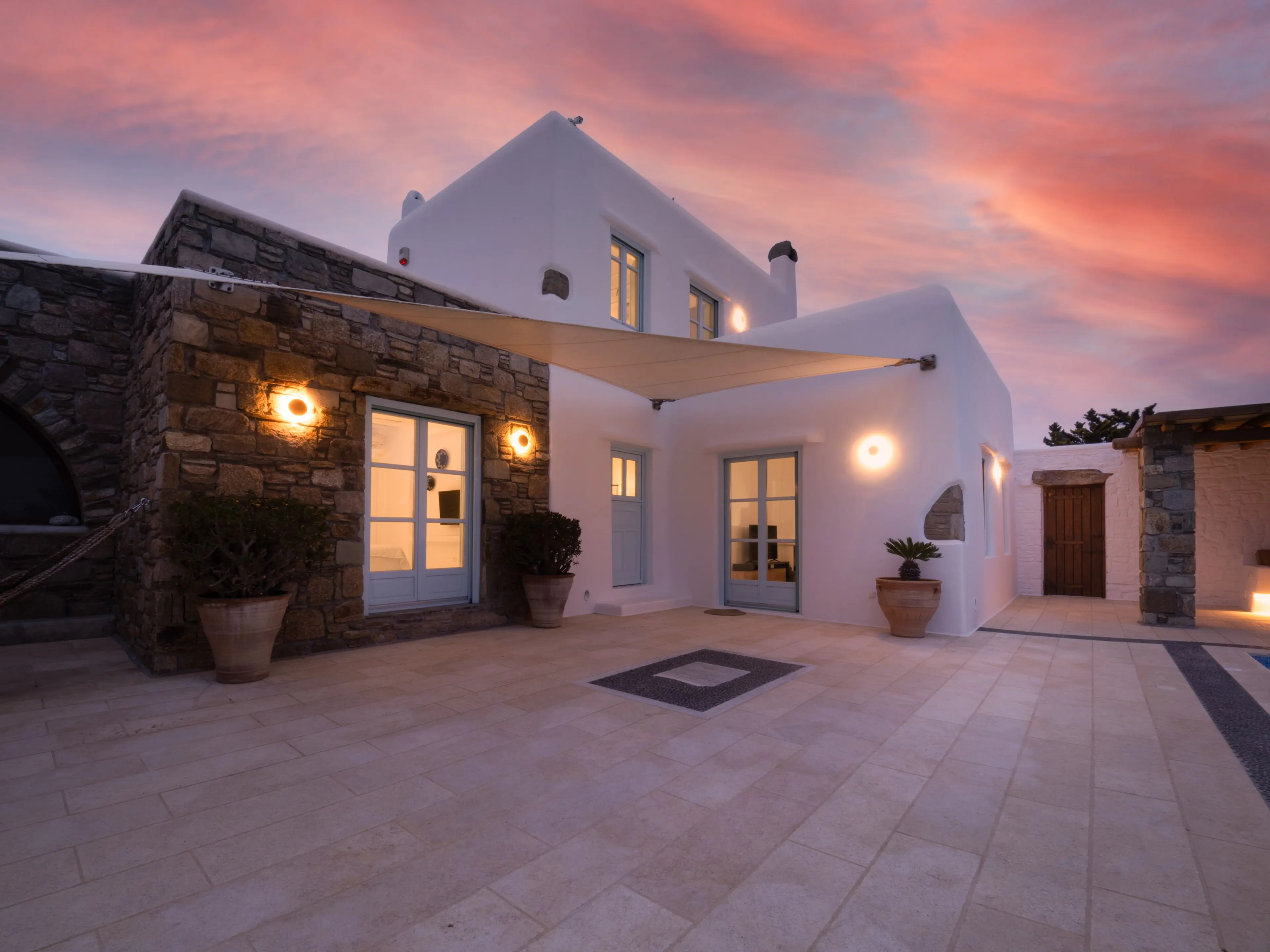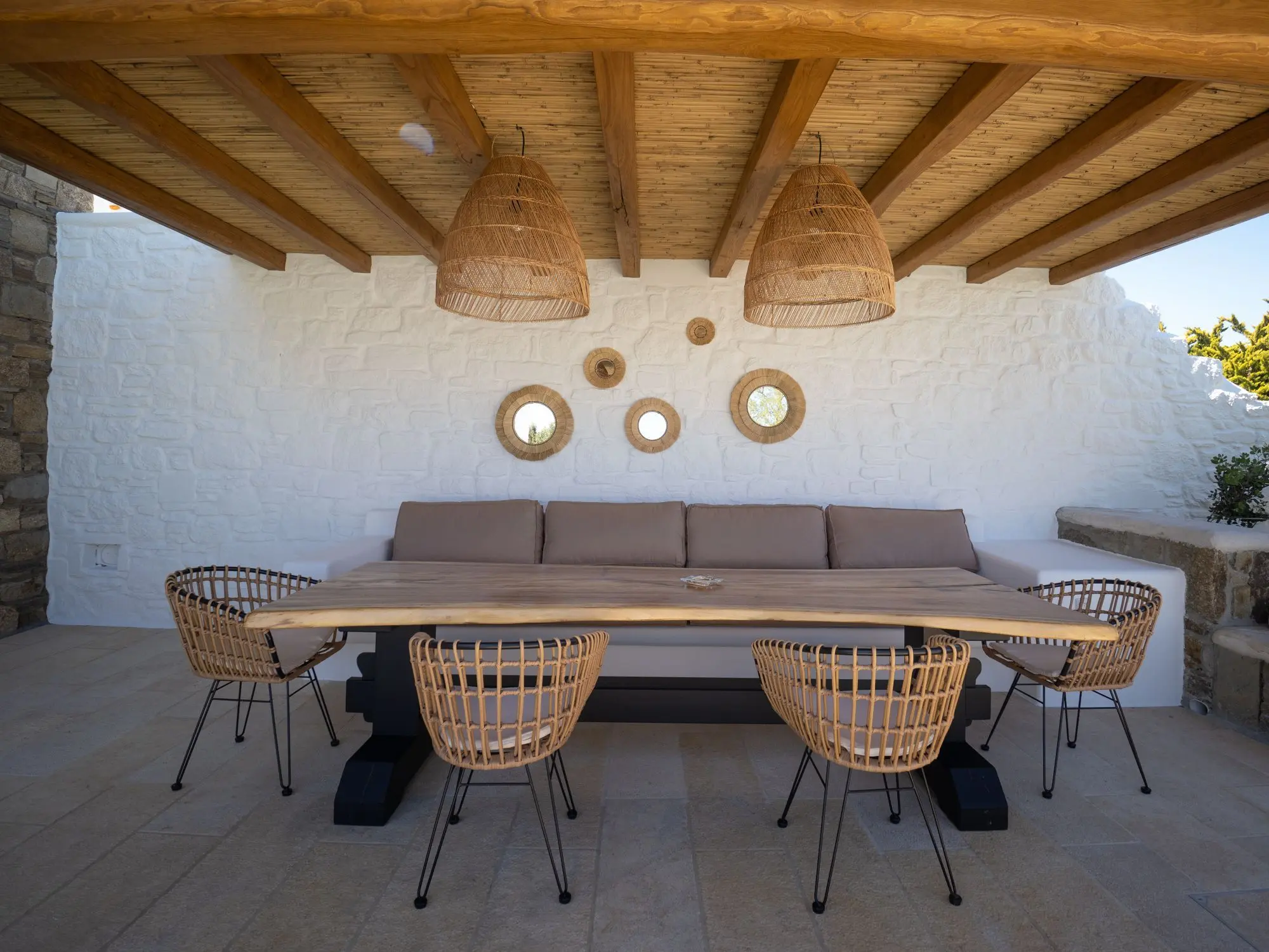 The twin Villas Gaia and Uranos offer privacy and quick access to key destinations at the same time. Situated in a tranquil area, they're centrally located too: 1 km from Nammos beach, 1.7 km from Platys Gialos beach, 2.5 km from Mykonos town, and 3.5 km from Scorpios. These twin villas are built side by side but designed to ensure privacy from one another while also providing the option to combine them into a 4 bedroom accommodation if desired.