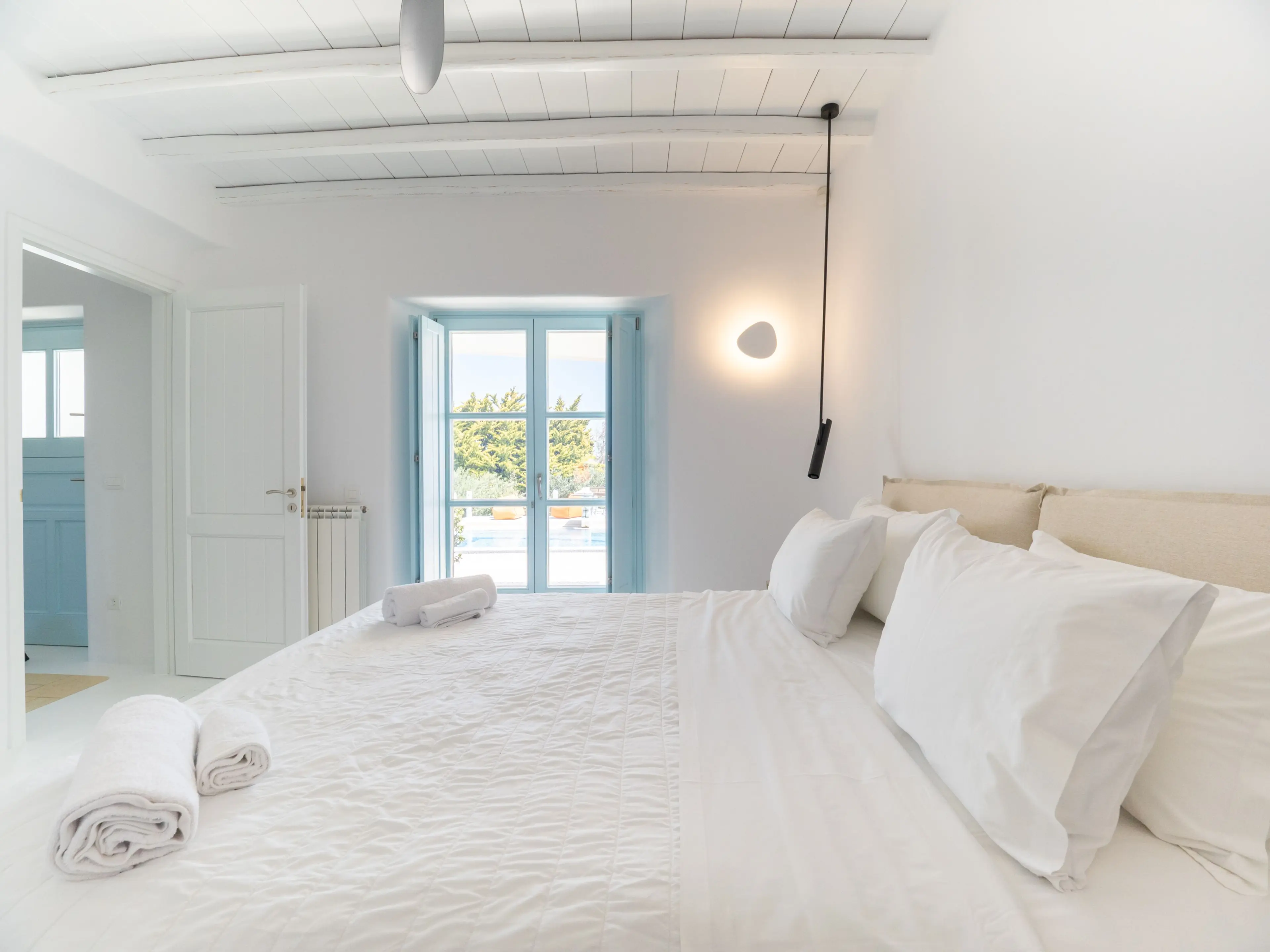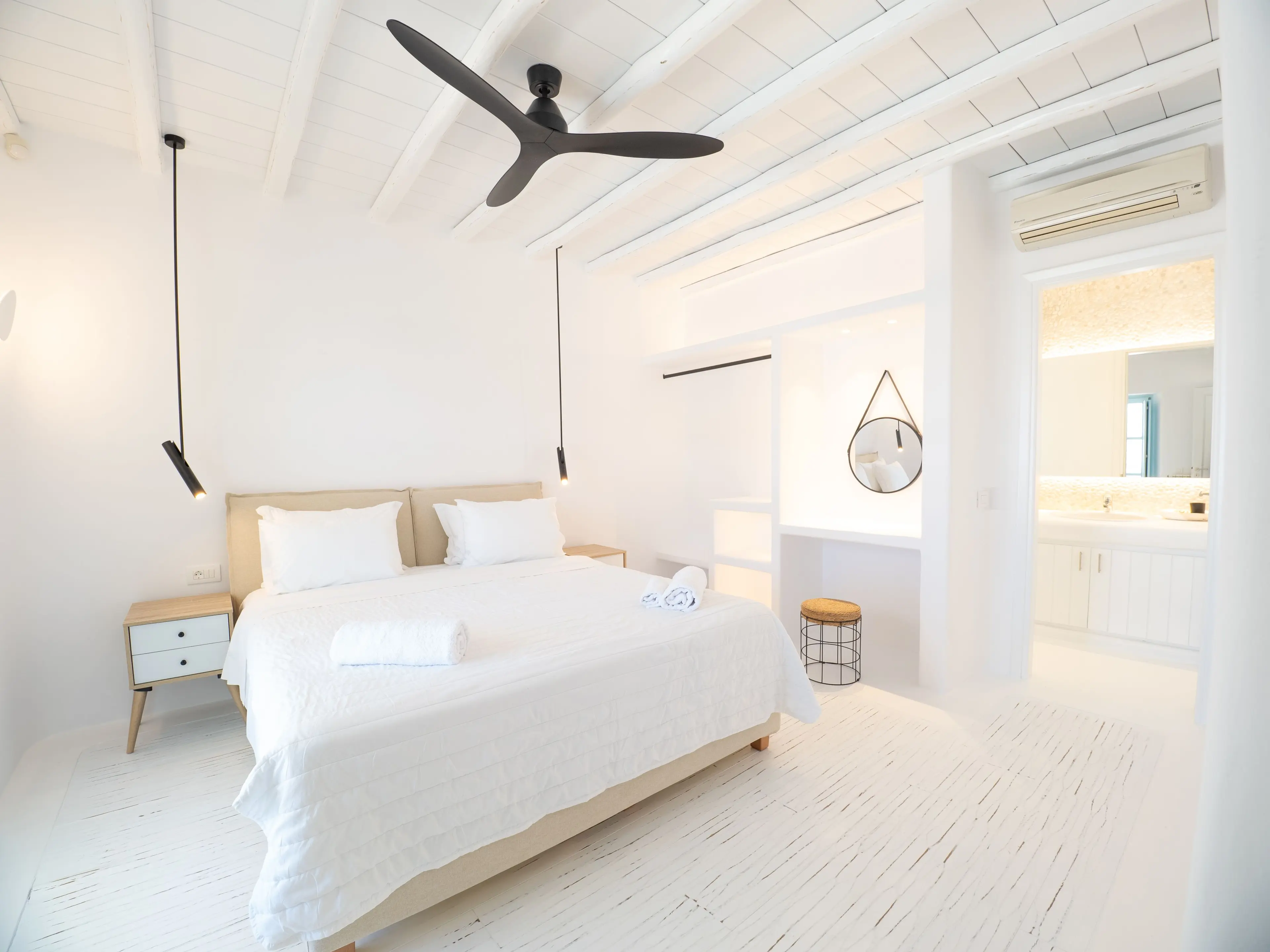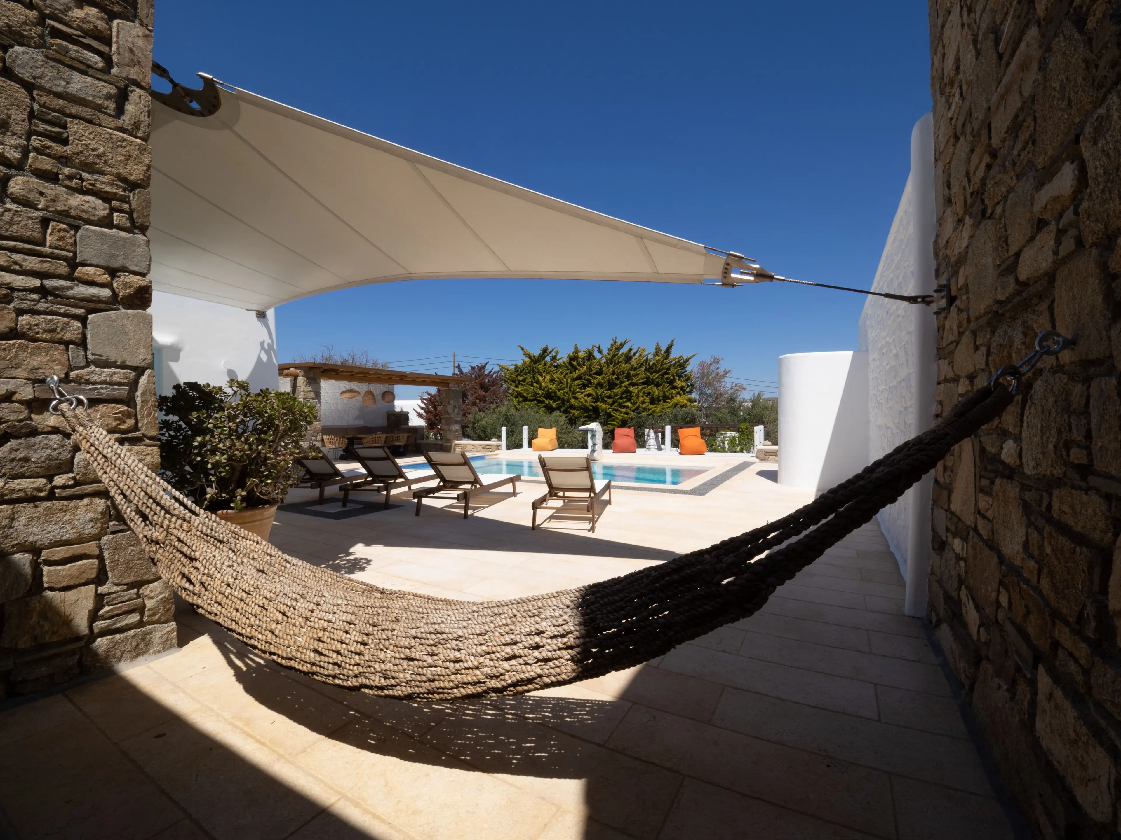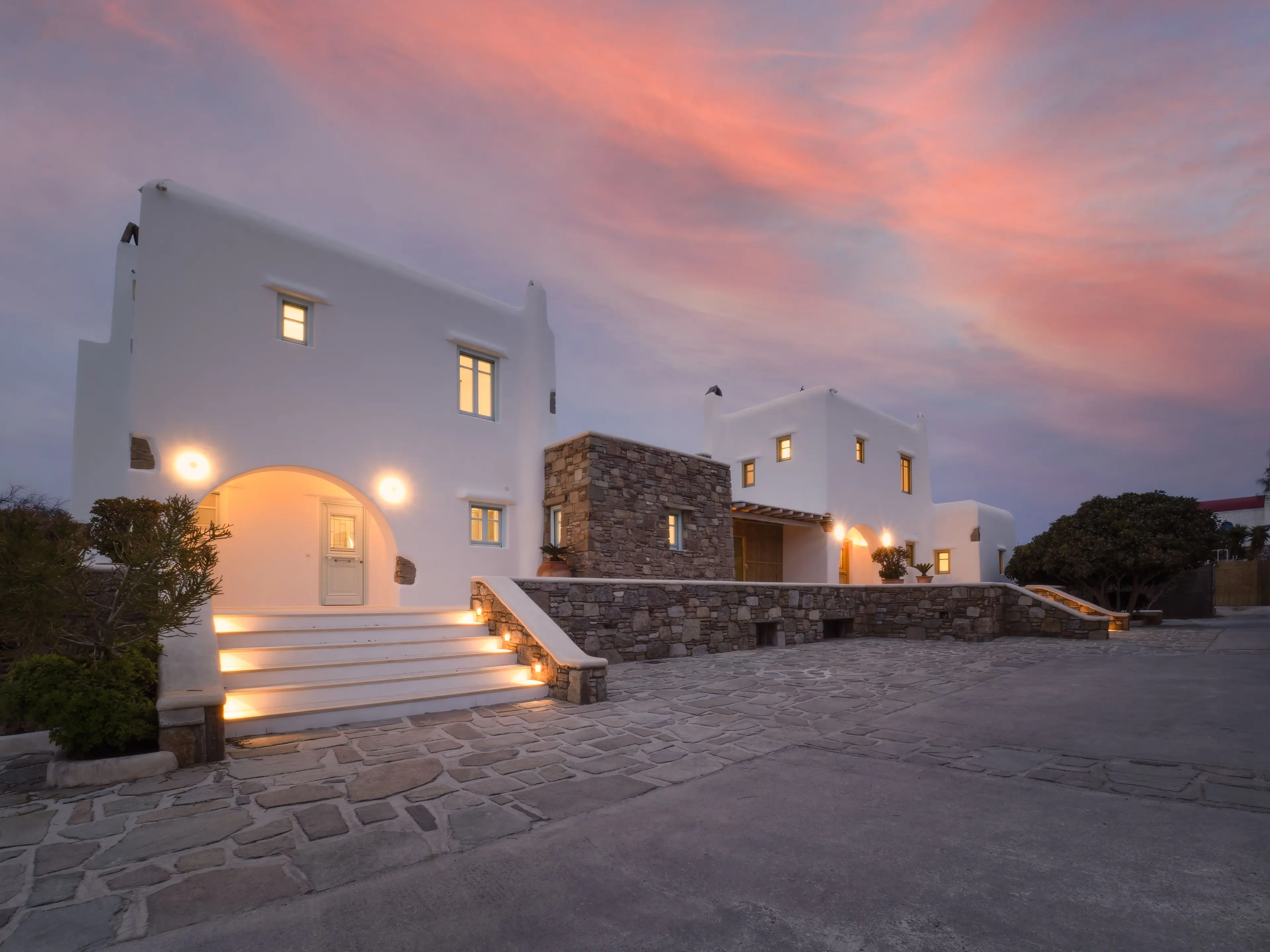 The twin Villas Gaia and Uranos offer privacy and quick access to key destinations at the same time. Situated in a tranquil area, they're centrally located too: 1 km from Nammos beach, 1.7 km from Platys Gialos beach, 2.5 km from Mykonos town, and 3.5 km from Scorpios. These twin villas are built side by side but designed to ensure privacy from one another while also providing the option to combine them into a 4 bedroom accommodation if desired.