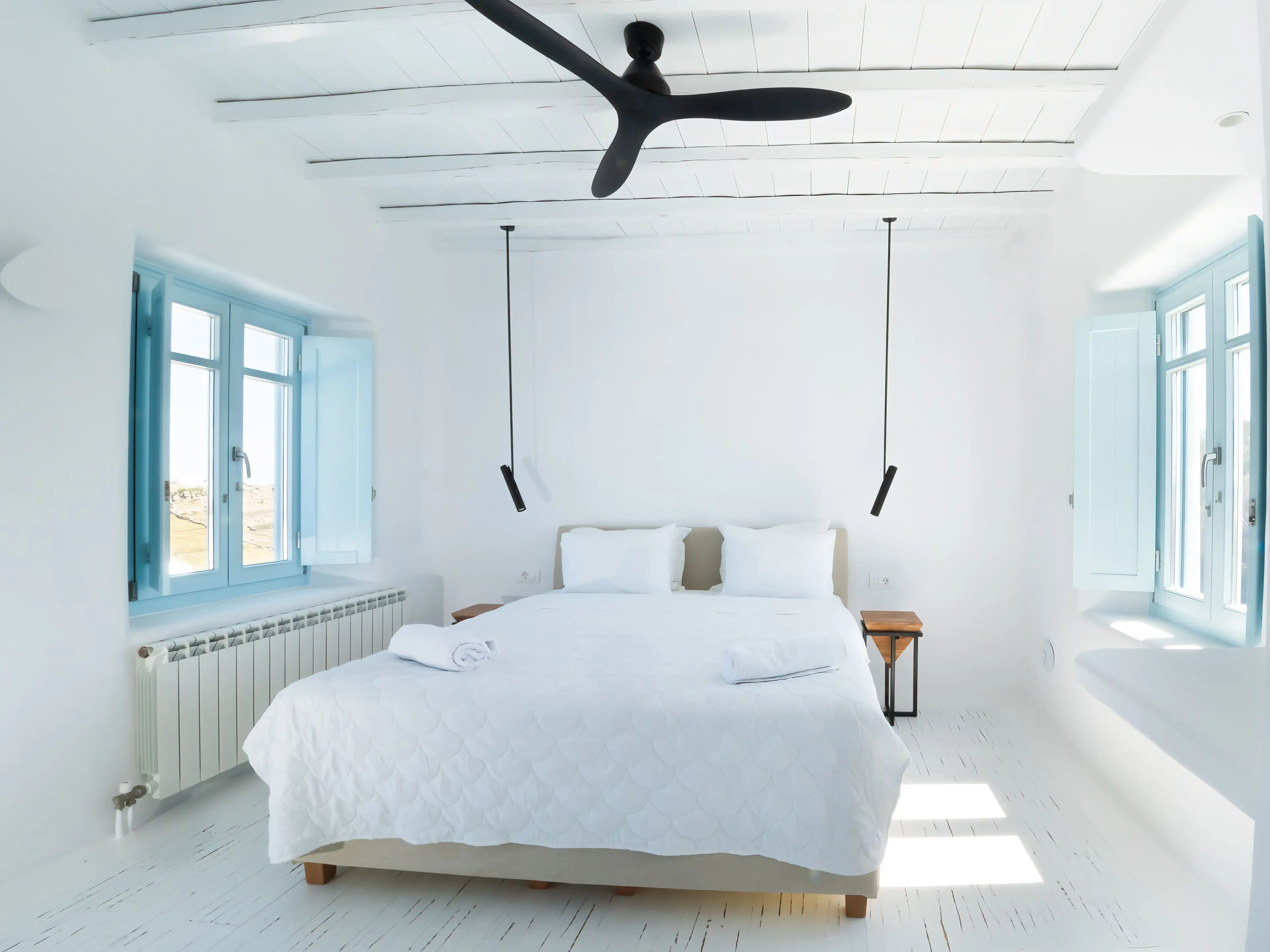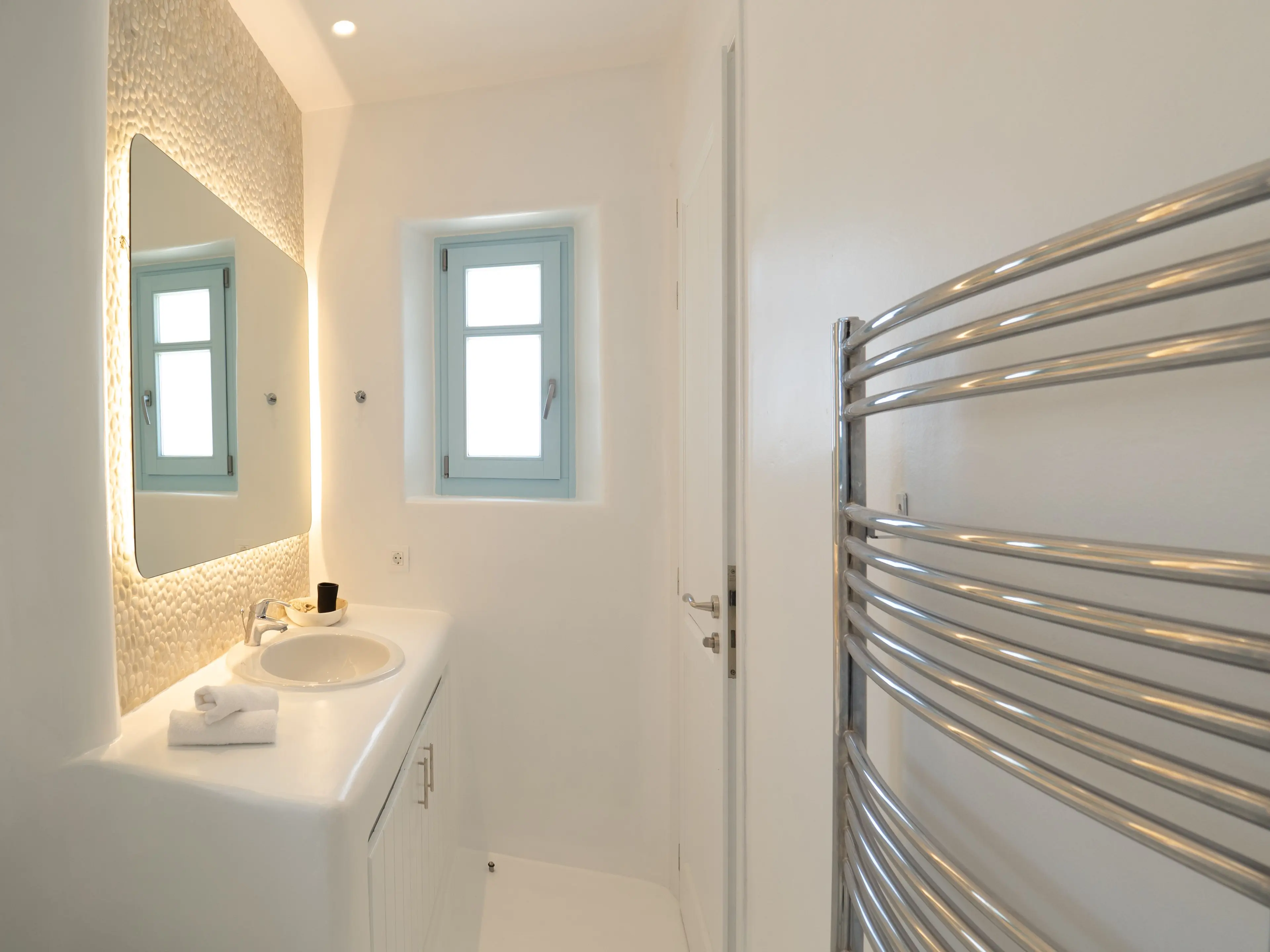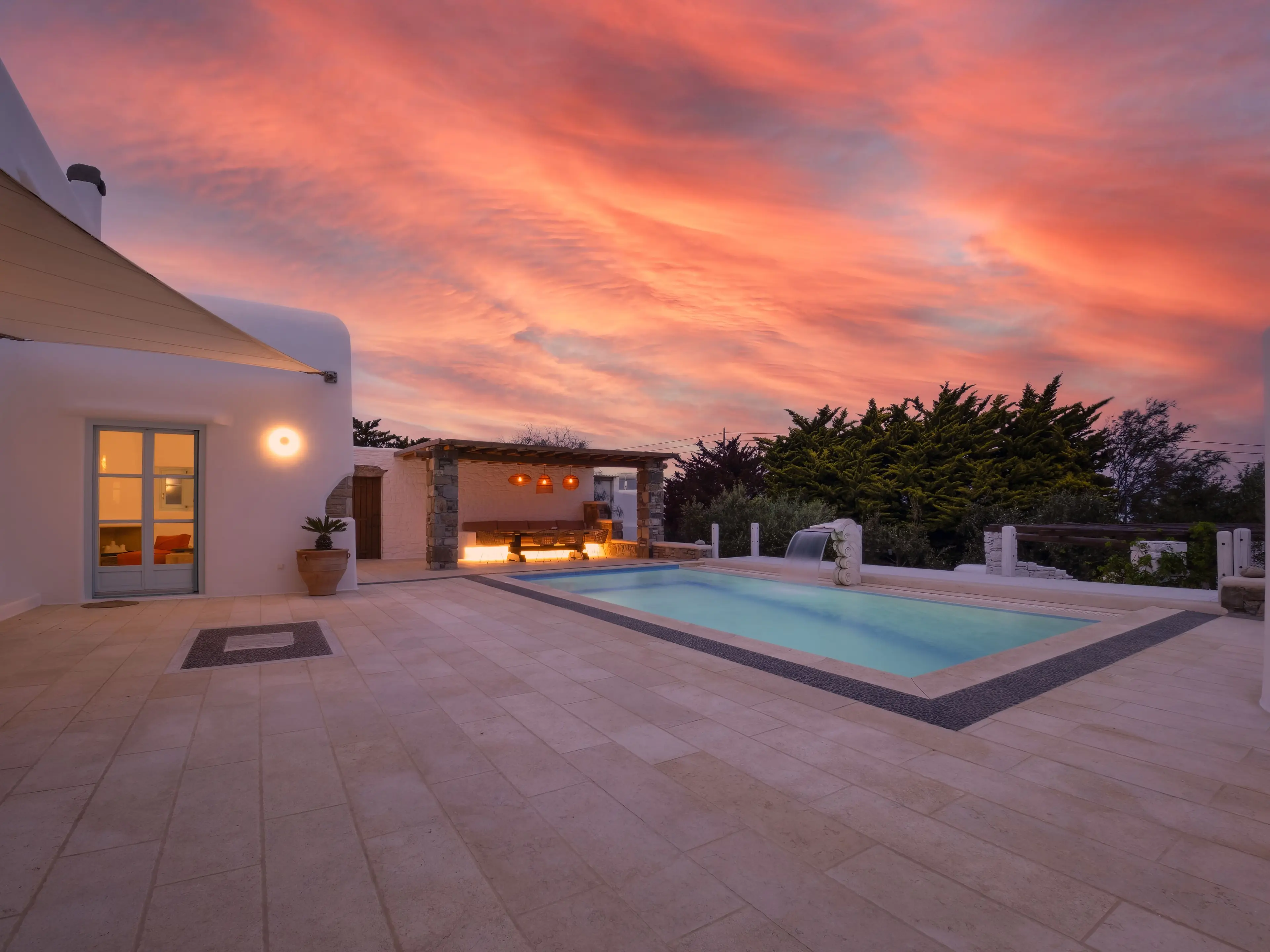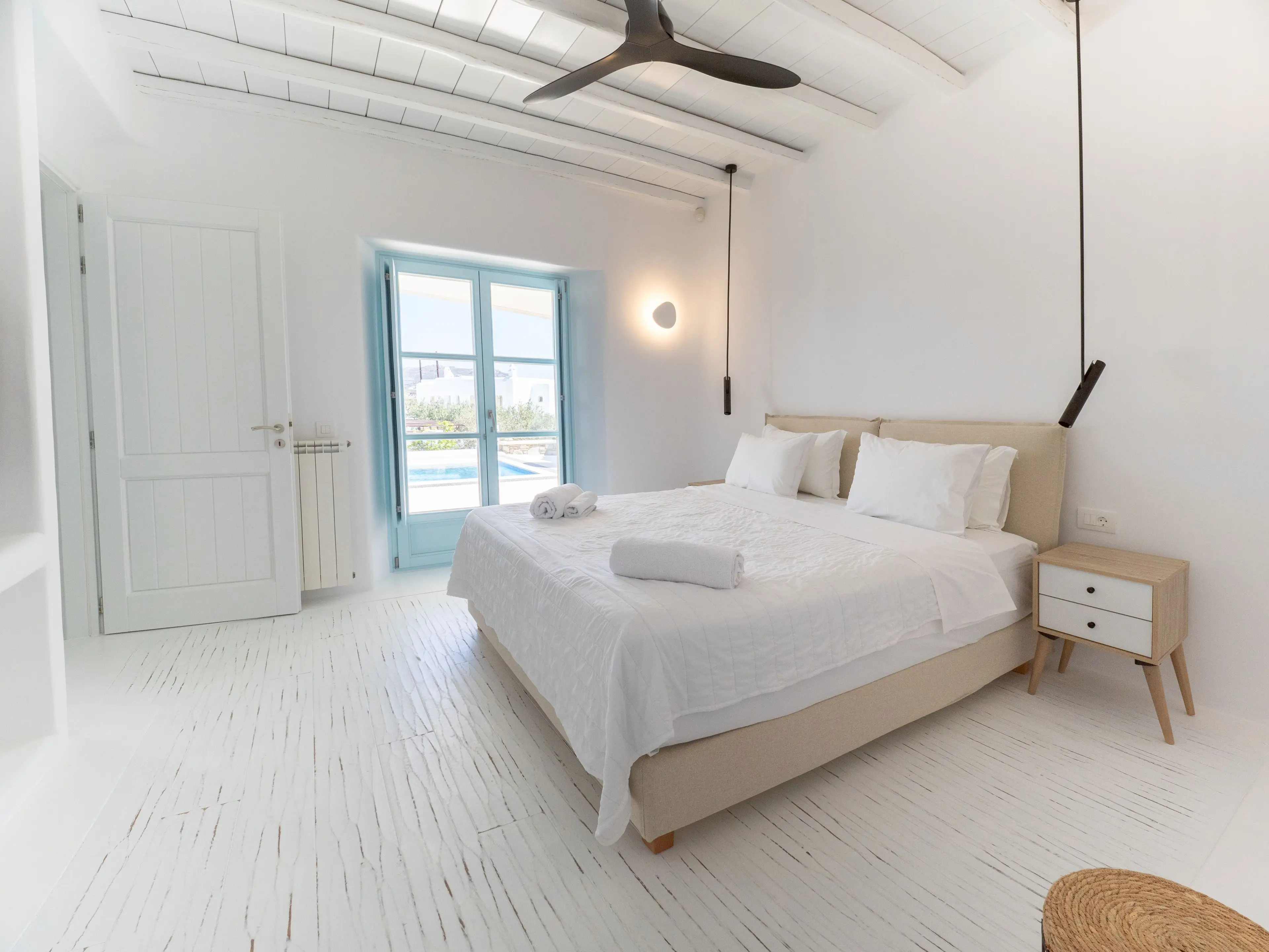 The twin Villas Gaia and Uranos offer privacy and quick access to key destinations at the same time. Situated in a tranquil area, they're centrally located too: 1 km from Nammos beach, 1.7 km from Platys Gialos beach, 2.5 km from Mykonos town, and 3.5 km from Scorpios. These twin villas are built side by side but designed to ensure privacy from one another while also providing the option to combine them into a 4 bedroom accommodation if desired.